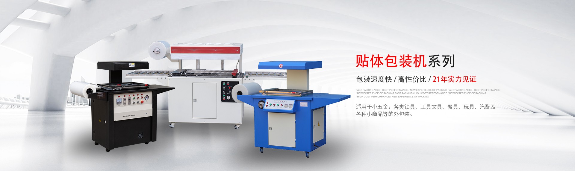 現主要產品有:全自動 L 型、邊封薄膜封切機、節能噴氣式內循環熱收縮機、貼體包裝機、吸塑包裝機、高周波塑膠熔接機、袖口式套膜機、枕式包裝機等多個系列的包裝機械